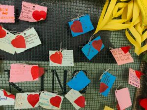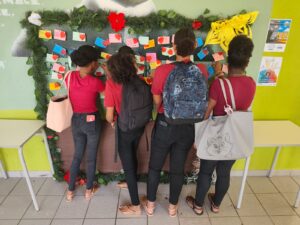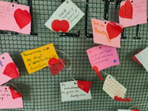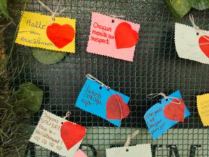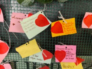 Encadrés par leurs enseignants, les élèves ont été invités à déposer un mot bienveillant, une phrase d’encouragement ou un message positif, sur ce mur décoré de feuilles et de fleurs colorées réalisées par les élèves de la section Animation Enfance et Personnes Âgées (AEPA) avec leur professeure Mme Bruyère.